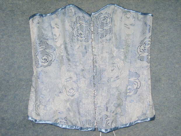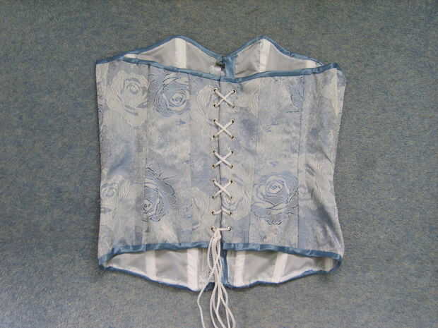 El patrón también no usa un cordón hueso-que es absolutamente fundamental si quieres espacio perfecto para sus ojales. He utilizado ojales de 4mm con un especial alicates de vario ojal y un conjunto de 25cm cordón de huesos, de diseño de Vena carva. los ojales de 4mm caben perfectamente en los huesos. Primera puso los huesos en la superficie de brocado y marcados los agujeros con un lápiz todo el camino. Entonces usando la perforación de la herramienta en los muelles que hice los agujeros en cada punto, a través del brocado y tela de la guarnición. Luego inserta el hueso entrelazado entre el brocado y el revestimiento y empareja los agujeros de hueso con los agujeros en la tela. Luego apliqué los ojales. Después se aplicaron los ojales, cosí alrededor del hueso usando un pie de cierre, sólo para asegurarse de que se movió cuando cordón! Para agregar definición al borde, en la parte trasera he insertado otro hueso de espiral normal al lado del lazada del hueso. Esto entonces fue acabado con un cordón blanco para complementar el otro color en el brocado. Voilà un corsé.