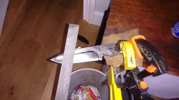 Si tienes horas y horas libres, paciencia, resistencia y fuerza de voluntad, probar a mano archivo cartabones de su cuchillo. Lo hice, me tomó 2 horas y media para obtener un lado terminado y fue cercana pero no perfecta. Llevé a mi fiel amoladora con una lija de grano 120 disco, 20 minutos más tarde... acabado biselado a un alto suficiente calidad y acabado, estaba bastante orgulloso de ser honesto.