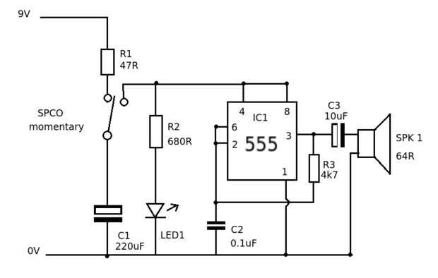 ¿Está bien lo que es una pistola sin sonido? simplemente nada! De modo que necesita sonido y luces... El sonido tenía 2 opciones. O reutilizar un circuito de muestreo de grabación (la puede encontrar en juguetes baratos) o a construir mi propio usando el 555 IC. La elección de puño le da una excelente calidad de sonido realista (sólo descargar de internet cualquier láser pistola sonido y grabar en el chip de muestreo), pero observé que después de muchas repeticiones que la calidad del sonido cae a cero y de la pistola laser se desvanece a algo realmente sin refinar. OK tal vez era el alborotador de chip pero tenía sólo uno. Por eso elijo la solución del circuito 555 compatibles. El sonido es bueno y se me termina de convencer que proviene de un arma del carril...