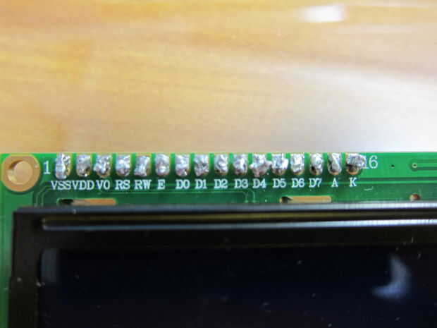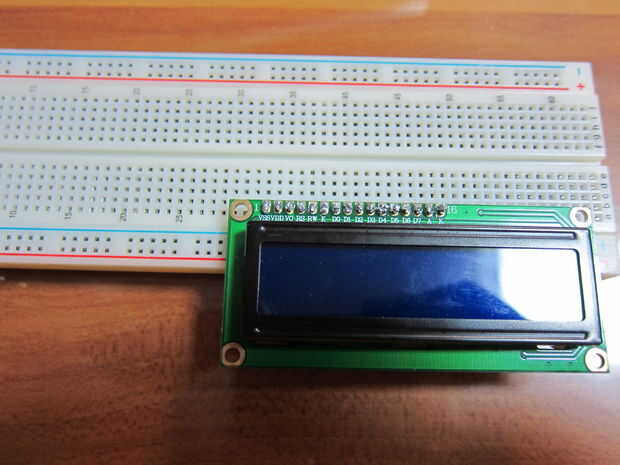 Se rompió una fila de pines a 16 pines, puse el lado más corto de la fila a los orificios de la pantalla LCD y soldar todos los pines. Luego utilizar un protoboard para la conexión. Seguido la instrucción en hacktronics.com y subido el código para el Arduino que proporcionaban.