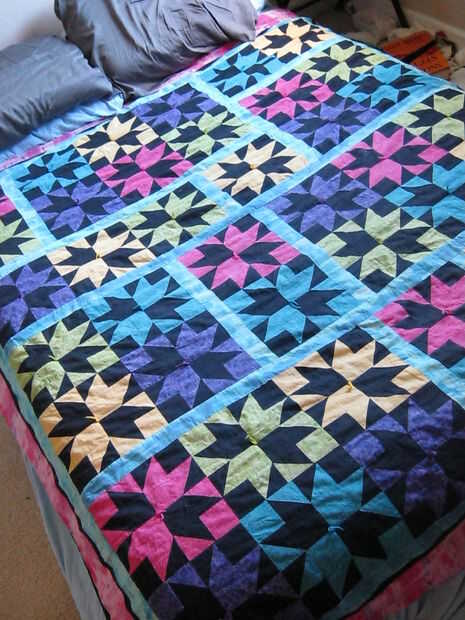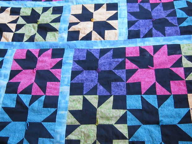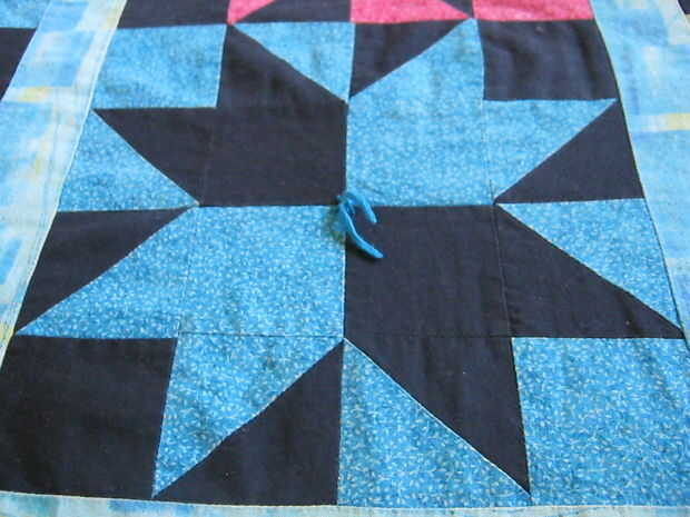 No quiero que del el patrón en lugar de tenerlo acolchado he hecho un lazo tejido. Tomé correspondiente hilo de bordar y en el centro de cada bloque bordó una pequeña 'x' y un nudo. Con las colas de hilo bordado lo sobresale desde el centro de cada bloque transformó mis bloques de estrellas y flores.