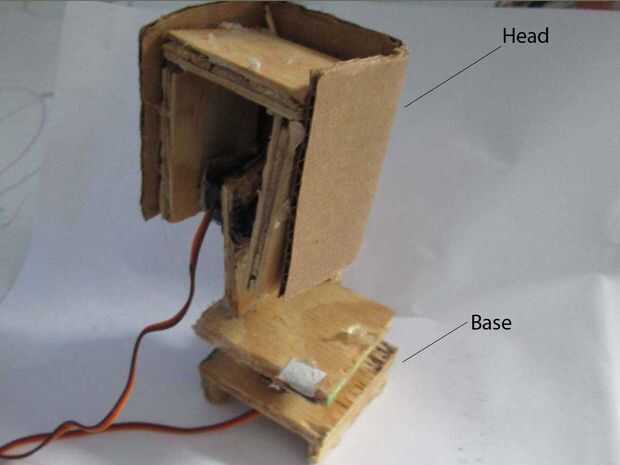 Pegar la parte superior de la cabeza del robot hacia el lado de la cabeza que no tiene ningún agujero. Pegue el horn del servo en la parte superior del cuello para que quede centrado el eje del servo y 1/2 pulgada para arriba en el lado que solo pegado a la parte superior.
