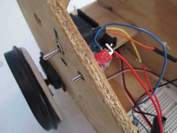 Tomar dos cables de puente largo y conectar el pin de control del servo izquierdo al D9 en el Arduino y el pin de control de servo impulsión derecha a D10 en el Arduino.