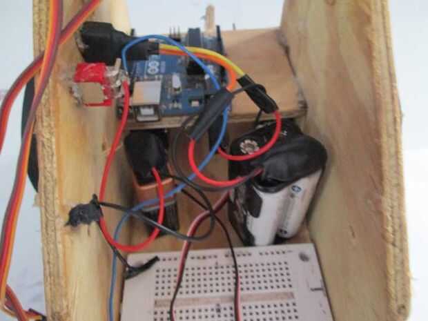 A continuación coloque en la pila de 9V para el Arduino y el paquete de baterías de 6V para los servos.