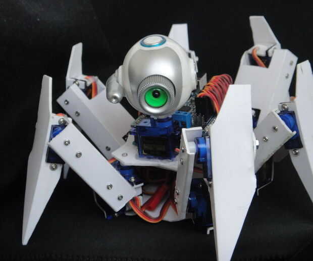 Un robot hexapodo es un vehículo mecánico que camina sobre seis patas. Puesto que un robot puede ser estáticamente estable en tres o más patas, un robot hexápodo tiene una gran flexibilidad en cómo se puede mover. Si las piernas se incapacita, el robot todavía puede ser capaz de caminar. Además, no todo de las piernas del robot es necesario para la estabilidad; otras piernas son libres de llegar a nuevas ubicaciones de pie o manipular una carga útil. Más de un robot hexápodos biológicamente están inspirados en locomoción de Hexapoda. Hexápodos pueden utilizarse para probar las teorías biológicas sobre la locomoción del insecto, control del motor y Neurobiología. 我的第一个机器人是六足机器人, 我给它起名:ET外星人, 是不是碉炸天呢? 这个机器人制作于2012年3月。 我设计的机器人每条腿有三个自由度, 头部有一个自由度。 它有19个舵机, 由Arduino开发板控制。 六足机器人是一种六条腿行走的机械移动平台。 由于机器人只要有三个或者多个腿支撑就可以保持稳定静止, 所以六足机器人移动起来具有很大的灵活性。 即使有的腿坏了, 机器人仍然能够行走。 此外, 并不是机器人每条腿都需要平稳落地; 其它的腿可以自由地移动或完成特定功能。 多数六足机器人是由六足运动生物启发的。 因此研究六足机器人有很大的意义, 可以被用来研究昆虫的运动, 电机控制, 神经生物学和生物理论。