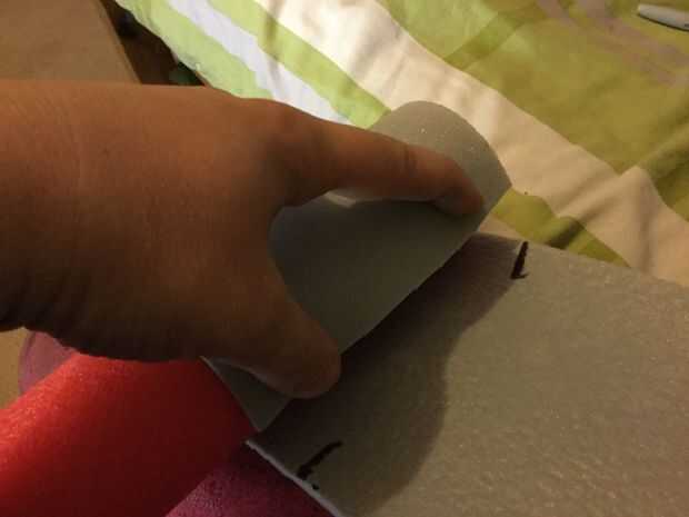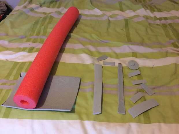 Luego cortar otro trozo de espuma del mismo tamaño y esto será la parte que usas para hacer los detalles, puede hacer formas lo que quieres de esto, cortar a tiras para ir a lo largo de la parte superior e inferior de la manija y otros rectángulos y círculos