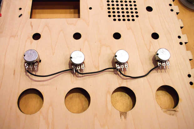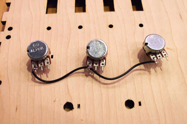 Colocar los tres potenciómetros para el 76477 que tienen un pin de tierra común en el panel de la caja. La soldadura de los pines de tierra común junto con el alambre negro.