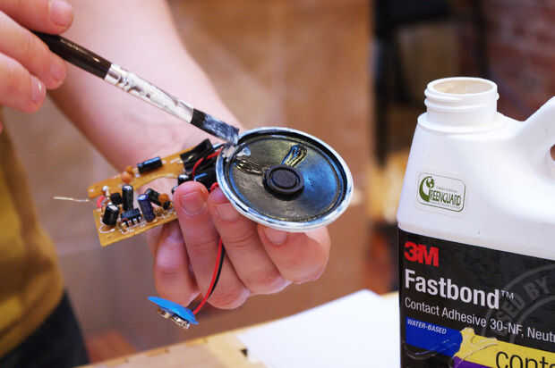 Afijo cono del altavoz del amplificador en la abertura grande del soporte del panel frontal usando Fastbond adhesivo de contacto de 30-NF. Siga las instrucciones de adhesivo de la etiqueta para asegurar un fuerte enlace permanente.