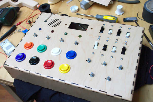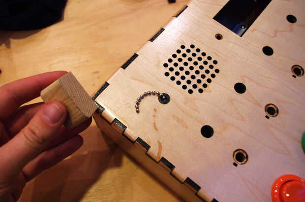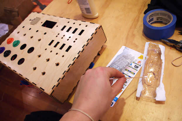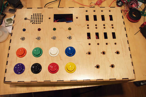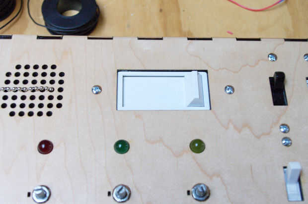 Finalmente, montado el final pulsadores de cuatro color en su lugar para completar el lado izquierdo de la caja.