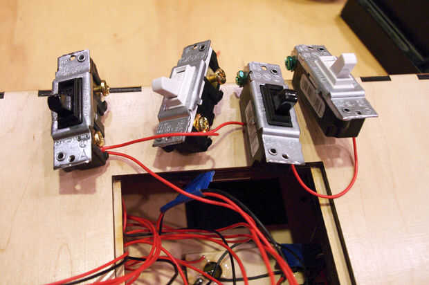 A partir de la parte superior derecha de la caja y mi forma de trabajo abajo e izquierda, cableado y había instalado los primeros cuatro interruptores. Se trataba de un exasperante dolor en el cuello.