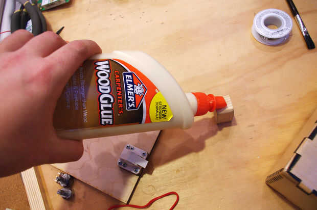 Una vez que ésos estaban en el lugar, yo había montado el interruptor de encendido. El interruptor de encendido montaje era sólo lo suficientemente profundo como para montaje al ras con la parte delantera de la caja. He planeado esto desde el comienzo y no incomodaron tratando de avellanar la tuerca de montaje. En cambio, ajustaron el interruptor en el lugar desde el interior. También corté un pequeño bloque de madera que encajan entre el interruptor y el fondo de la caja. Entonces pegué este pedazo de madera para evitar que el interruptor de nunca conseguir empujado hacia fuera. ¡ Solo espero que nunca se rompe, porque va a zurcir casi imposible quitar.