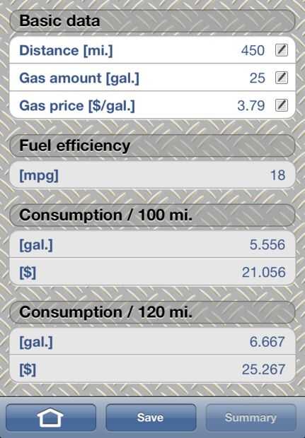 - Consumo de viaje muestra cuántos galones de gas que necesita para su viaje diario. Esta función no está disponible en la app gratuita. En la imagen, se muestra un valor de 120, que es mi viaje diario a y el inicio del trabajo.