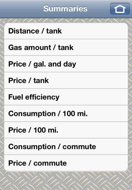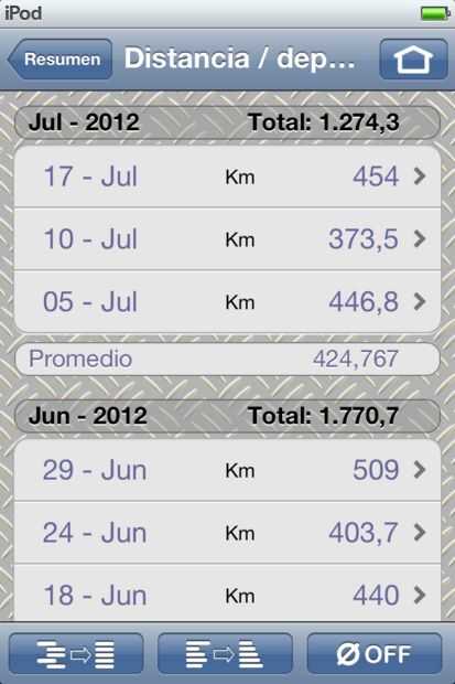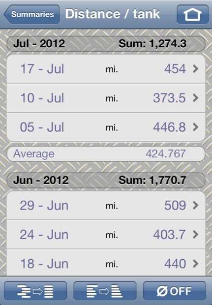 - Si tiene seleccionado un extracto, se aparece una lista de todos previamente datos con la opción para agrupar los datos mensualmente, para mostrar los totales donde conveniente (e.g. gas total costo por mes), total media o promedio mensual. Para seleccionar estas opciones, cada Resumen tiene tres botones en la parte inferior de la UIViews Resumen. El primero de ellos agrupará todos los datos por mes. El segundo botón será ordenar todos los datos de ascendente o descendente, dependiendo de si son buenos valores más pequeños o más grandes. Los valores de "buenos" se suponen que para estar en la cima de las listas. El tercer botón le mostrará los valores medios (si los datos se agrupan por mes, obtener promedios mensuales, si no está agrupado, se obtiene la media de todos los valores).
