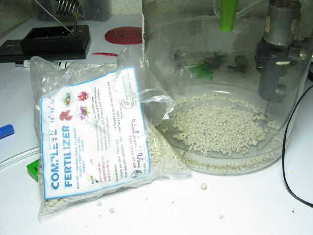vi este pack de fertilizantes ahí mi nuestro jardín, que era de mi papá. Es un fertilizante completo y controlado típico para uso general. Para mi setup, acaba de dejar 2 cucharadas de mesa de fertilizante. Si el interesado para la nutrición de la planta, hay algunos fertilizantes diseñados para montajes hidropónicos encontradas