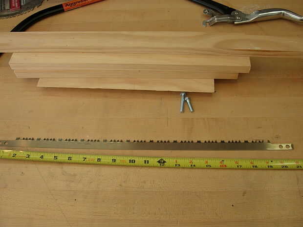 Cuerda para mi sierra es paracord, muy fuerte. Puede utilizar cualquier cuerda que es lo suficientemente fuerte como para manejar la presión que se pondrá sobre él para obtener la hoja de sierra lo suficientemente apretada. Toma un poco de tensión para hacer esto. Puede alambre de ues si no vas a desmontar la sierra muy a menudo.