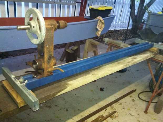 Primera etapa de la fabricación fue establecer un marco básico para llevar a la acción principal, poste de la herramienta y cola stock. Aquí está la base con el pelado abajo de la cabeza del taladro montada en el bastidor. La cama del torno es 50 X 25 mm X1500 laminado en sección hueca (2,6 mm). Este es el único acero que he tenido que comprar hasta ahora. El resto de las piezas proceden de cannibalising del taladro y de desecho que tenía alrededor del lugar