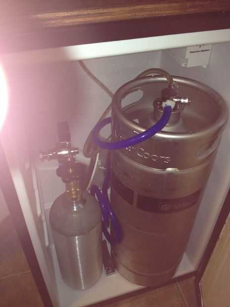 originalmente puse el tanque de CO2 dentro del kegerator de huella mínima. Hay dos problemas con esto - acceso regulador significa mover los barriles fuera del camino, en segundo lugar el tanque de CO2 frío disminuye la presión del tanque.Se tiene qu