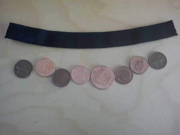 1. algunas monedas de cobre antiguas o cualquier cosa metálica que es suave y redondo. Elegí unos centavos y una moneda de 2 peniques en el que yo tenía por ahí. También algunos estiran elástico cortado a la medida de la muñeca que está destinado.