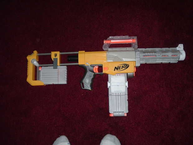 hice este mango para mi recon de la implementación y ahora se ve como un M16. Conseguí esta idea de mi otro mod éxito "My FuryFire REV-10" porque mi desplegar se rompió y Monte un stock en mi furyfire y ahora quiero montar un mango en mi reconocimiento. Sabe usted cómo el vista que viene con el reconocimiento como "aspira bien, este ámbito será probablemente"apestan", pero tiene un mango tan... Puedo trepar a los árboles fácilmente, martillo fácilmente, y se ve como un M16.   M16, un rifle americano que puede ser semiautomático o automático también dispara un proyectil de punto pelota.   Hice esto usando una mano para taladro 4 agujeros y atornillar el mango justo como lo hice con el mod FuryFire. Pero tenía que vio la empuñadura de la pistola.