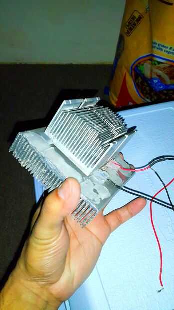 Intercala la Peltier entre dos disipadores de calor de aluminio. Una más grande que el lado caliente. Utiliza llano apagado el epoxi de acero del estante para pegar los disipadores de calor sobre el Peltier y que ha mantenido firme durante algunos años y la capacidad de transferencia de calor es genial!