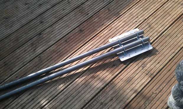 así que la idea era que; el respaldo se enrosque en la placa metálica. perno de la placa metálica 2 x postes de acero. los postes de acero se sujete a la parte horizontal del carril del gancho agarrador en la parte posterior de mi estante rentec. Aquí puede ver la placa y los postes de acero. postes eran sobre 10 quid (ebay) los gases de escape abrazaderas un par de quid (los de rosca larga)