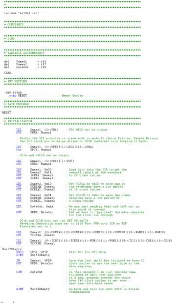 La razón por la que podemos conseguir el SPI para trabajar de esta manera es que en modo de esclavo de que no puede insertar el módulo una parada de bits lo hace en MASTER mode. Está marchando al ritmo del tambor de otra persona. Cuando entra el siguiente reloj, debe simplemente cumplir y dar el siguiente bit de datos (si está lista) o no lo contrario. Hablando de reprobar. Sólo tienes 9 ciclos de reloj para cargar el registro de datos una vez que el último byte está claro. Esto significa que corte un poco fino utilizar interrupciones a menos que use un "estúpido truco AVR" afeitarse unos ciclos el interrupción del tiempo de respuesta.