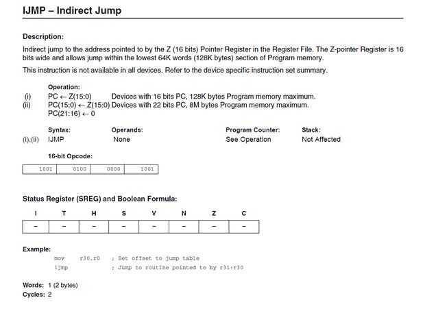 Aquí es donde la instrucción del IJMP viene al rescate. Arriba se muestra la página del conjunto de instrucciones del AVR. Nosotros estamos utilizando como una declaración de caso/interruptor en una máquina de Estados de software. En cada estado podemos establecer lo que debería ser el estado siguiente sin tener que hacer cualquier evaluación.