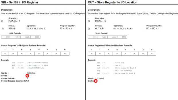 De hecho lo único que el AVR no brilla en es cambiar las brocas en registros I/O. Esto toma dos ciclos de reloj como se muestra en los detalles de las siguientes instrucciones de OSE. La CPU tiene que leer el registro, modificar y escribir de nuevo. Es una de las instrucciones de ramificación no pocos del AVR para tomar dos relojes. (Nota: el AVR XMega ha solucionado este problema y ahora está a sólo 1 reloj)
