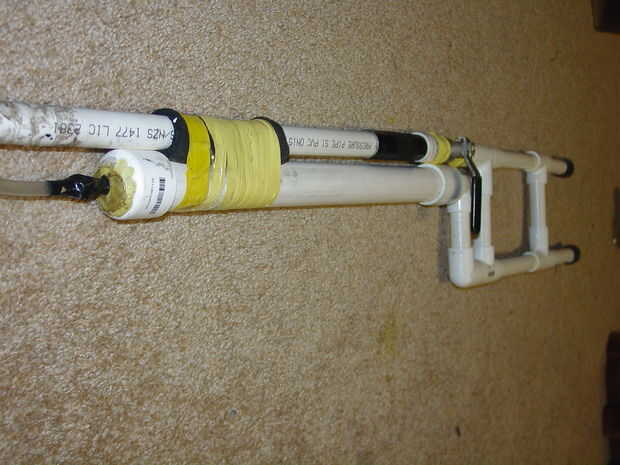 un rifle de aire simple que fue hecho de un trozo de línea de freno, una cerbatana, las piezas de conexión tipo surtidos-tanque de aire y algo de madera (tipo desconocido de) que teníamos puesta alrededor.Aspectos básicos:Lo que necesitará construir