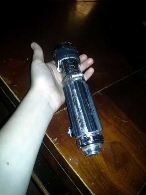 Así acabo el sable de luz de Darth Vader de la Disney Store de mercancía despierta a la fuerza que tienen y estaba tratando de hacer que un titular o clip que no conseguiría de la manera y el no daño el sable de luz original. después de atornillar co