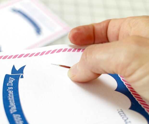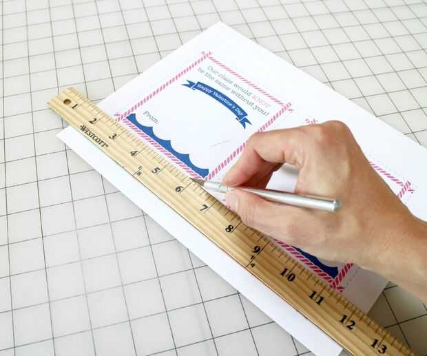 Sobre una estera de corte, utilice su regla y cuchillo del exacto para cortar las tarjetas dentro de las líneas de corte azul punteadas.