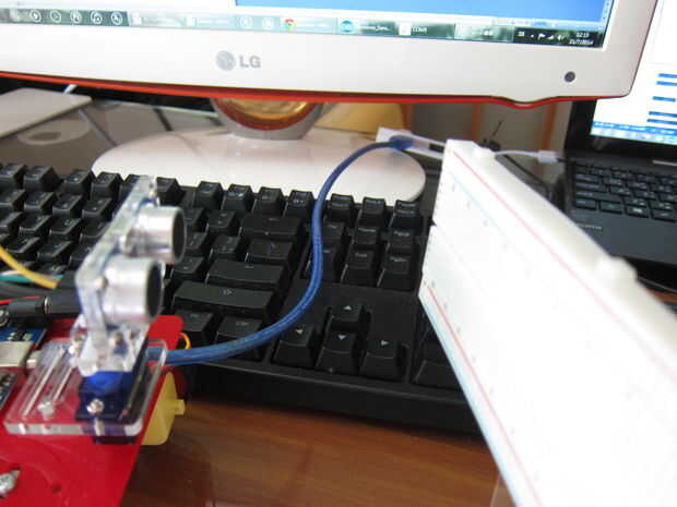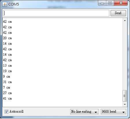 #define trigPin 5#define echoPin 6void setup() { Serial.begin (9600); pinMode(trigPin, OUTPUT); pinMode(echoPin, INPUT);}int CheckDistance(){ long duration, distance; digitalWrite(trigPin, LOW); // Added this line delayMicroseconds(2); // Added this line digitalWrite(trigPin, HIGH);// delayMicroseconds(1000); - Removed this line delayMicroseconds(10); // Added this line digitalWrite(trigPin, LOW); duration = pulseIn(echoPin, HIGH); distance = (duration/2) / 29.1; return distance;}void loop() { int testDistance = CheckDistance(); /// get object distance using ping /// if object is more than 50 cm away it is out of range if (testDistance >= 50 || testDistance <= 0) /// if object is more than 50 cm away it is out of range { Serial.println("Out of range"); } else /// object is closer than 50cm, print distance { Serial.print(testDistance); Serial.println(" cm"); delay(500); ///wait half a sec before next ping} En el IDE de Arduino, seleccione Herramientas > Serial Monitor. Muestra la distancia Si tiene éxito.