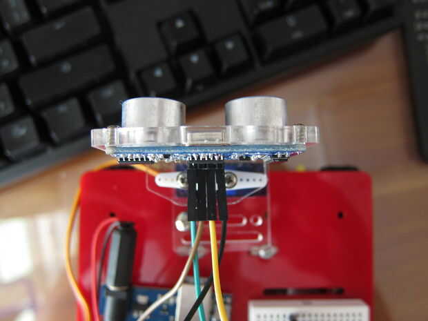#define trigPin 5#define echoPin 6int motorPin = 8; //right side to IB - forwwardint motorPin2 = 9; //left side to IA - forwwardint motorPin3 = 10; //right side to IA - backwardint motorPin4 = 11; //left side to IB - backwardvoid setup() { Serial.begin (9600); pinMode(motorPin, OUTPUT); pinMode(motorPin2, OUTPUT); pinMode(motorPin3, OUTPUT); pinMode(motorPin4, OUTPUT); pinMode(trigPin, OUTPUT); pinMode(echoPin, INPUT);}void forward(){ digitalWrite(motorPin, HIGH); digitalWrite(motorPin2, HIGH); digitalWrite(motorPin3, LOW); digitalWrite(motorPin4, LOW); } void backward() { digitalWrite(motorPin, LOW); digitalWrite(motorPin2, LOW); digitalWrite(motorPin3, HIGH); digitalWrite(motorPin4, HIGH); } void turnLeft() { digitalWrite(motorPin, HIGH); digitalWrite(motorPin2, LOW); digitalWrite(motorPin3, LOW); digitalWrite(motorPin4, HIGH); } void turnRight() { digitalWrite(motorPin, LOW); digitalWrite(motorPin2, HIGH); digitalWrite(motorPin3, HIGH); digitalWrite(motorPin4, LOW); }int CheckDistance(){ long duration, distance; digitalWrite(trigPin, LOW); // Added this line delayMicroseconds(2); // Added this line digitalWrite(trigPin, HIGH);// delayMicroseconds(1000); - Removed this line delayMicroseconds(10); // Added this line digitalWrite(trigPin, LOW); duration = pulseIn(echoPin, HIGH); distance = (duration/2) / 29.1; return distance;}void loop() { int testDistance = CheckDistance(); /// get object distance using ping if (testDistance >= 30 || testDistance <= 0) /// if object is more than 30 cm away it goes forward { forward(); } else /// object is closer than 30cm, turns right { turnRight(); } delay(500); ///wait half a sec before next ping} El resultado parece ok.