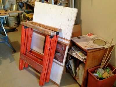Lo que no tengo es un montón de espacio para almacenar una tabla vio, así que quería una sierra que almacena casi plana. Ver la segunda foto. Cuando quiero utilizar la sierra, yo de nuevo mi coche fuera del garaje y arriba mi sierra cerca de la puerta de plegamiento caballetes.