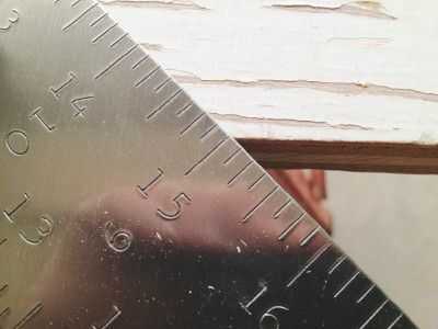 Caminé alrededor de al la parte trasera de la sierra y el cuadrado enmarcado por lo que la esquina se encuentra sobre la ranura del calibrador de inglete. Coloqué la plaza por lo que las marcas de 15 pulgadas en ambas piernas de la Plaza cruzan el borde posterior de la tabla. Ver la segunda foto. Ajuste el calibre de ingletes para que su cara uniformemente toca una pierna de la Plaza. A ver la primera foto .