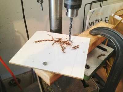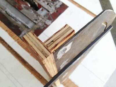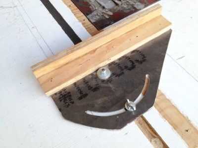 Ver la segunda foto de cómo se cortó el arco de apertura en el acero de 1/8 de pulgada. Estoy ilustrando con un pedazo de 1/8 de pulgada Masonite. Perfore un agujero de 1/4 de pulgada para el punto de pivote. Perno de acero un 2 x 4 para que el acero pueda girar izquierda o derecha. Abrazadera de 2 x 4 a la mesa de una prensa del taladro. Perforar una serie de agujeros uno junto al otro como los pivotes de acero a través de su arco. Después de la fila de agujeros había sido perforada, solía el borde de una rueda abrasiva en una 4 pulgadas amoladora cabeza de ambos lados para quitar la mayoría del metal entre los orificios. Luego usé un archivo para suavizar y ajuste la ranura del arco por lo que el acero pueda girar sin problemas con la cerradura de perno en su lugar.