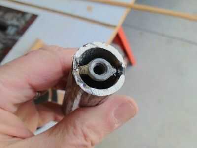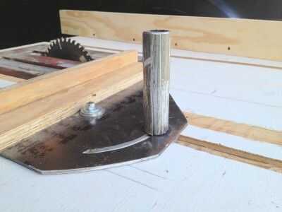 Ver la quinta foto. Es un identificador para el calibre de ingletes muy similar a la manija en el calibre de ingletes que compré de Sears para mi primera sierra de conversión hace 40 años. Es una característica muy útil. Ya he ido encontrando la tuerca que se indica en la primera foto de este paso tedioso y difícil. Yo corte dos ranuras en el extremo de un trozo de tubo de agua 3/4 de pulgada. Que les presenté hasta que las alas de la tuerca de mariposa podrían introducir en ellos. Coloca el pedazo de la pipa de agua sobre la tuerca de mariposa y tachuela soldada con autógena en el lugar. Ver la sexta foto. Terminé las soldaduras y utiliza una rueda de corte para hacer ranuras en el lado de la tubería de agua para un buen agarre, sobre todo cuando Afloje el calibre de ingletes para ajustarla.