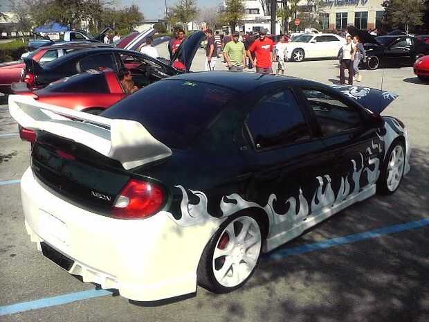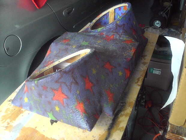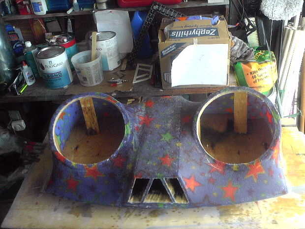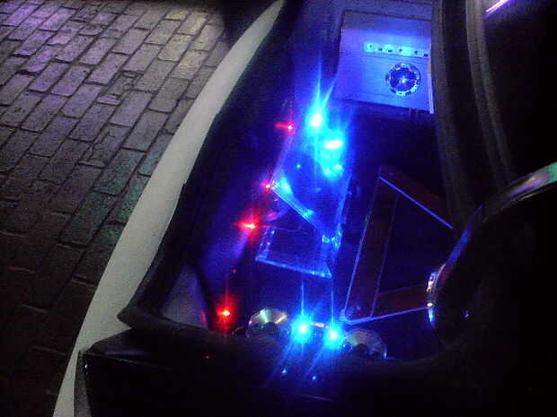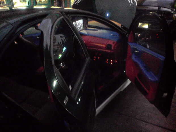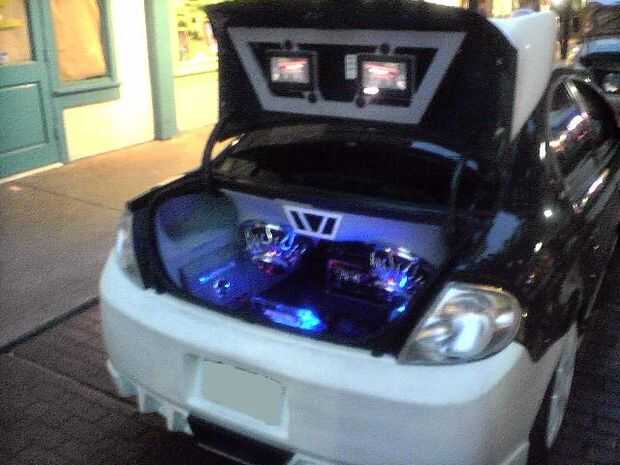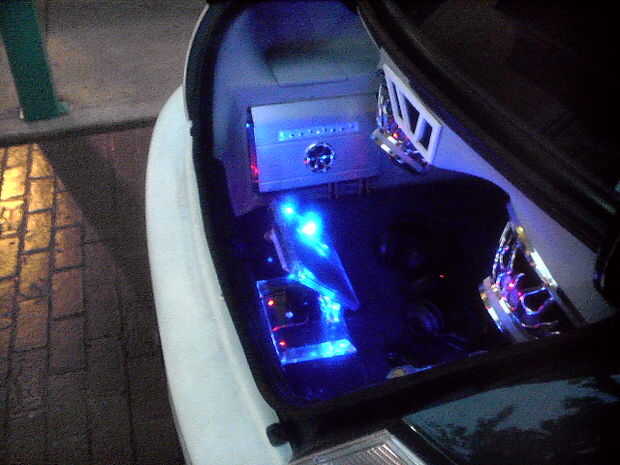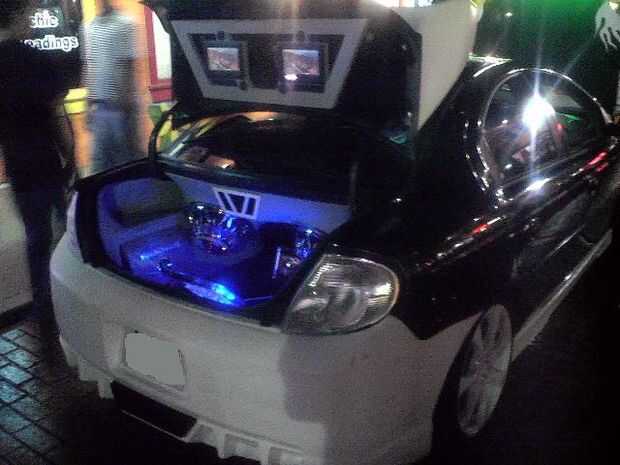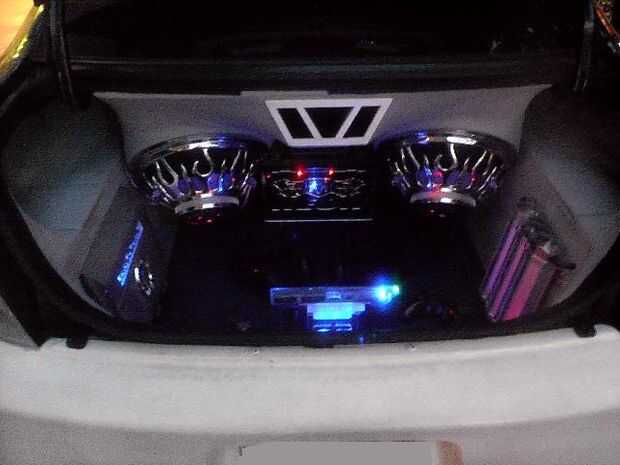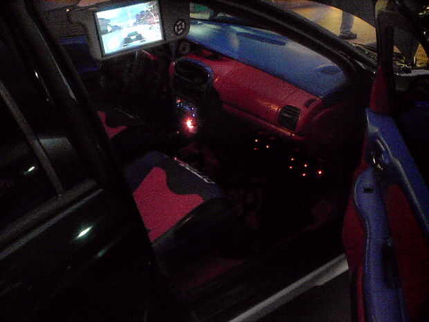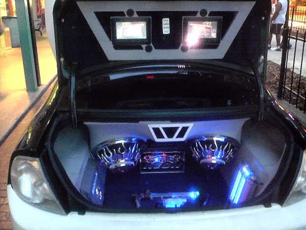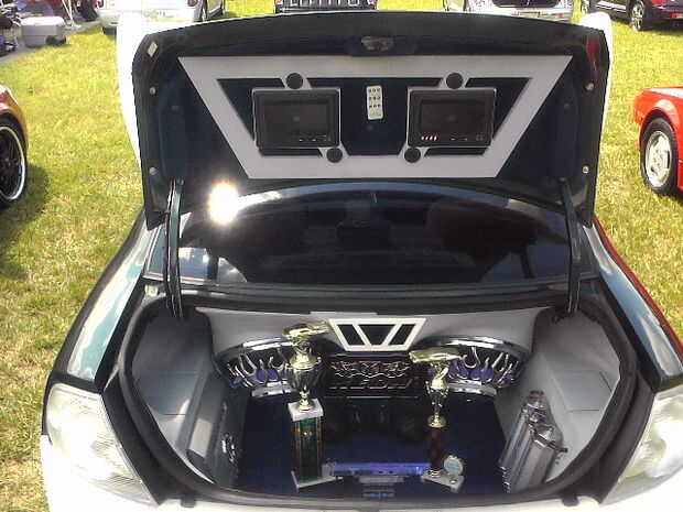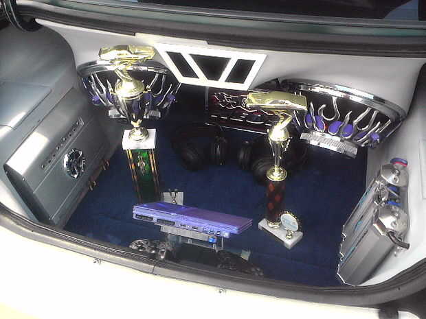 El piso está forrado con moqueta azul. La PS2 consolado (caso) es un azul translúcido con LED adentro para darle un brillo agradable. También la tapa del tronco posterior tiene LEDs apuntando a los altavoces dándole esa luz agradable cuando en afectan en la noche! En la tapa del tronco tengo un marco personalizado que fue construido con madera contrachapada y cuerpo relleno de arena para un acabado liso con dos monitores de 7 pulgadas con dos pequeños altavoces/altavoces y mandos. El diseño del marco de la celebración de los monitores de los troncos fue hecho para que coincida con los puertos de aire caja de altavoz que también fue inspirado por la forma de mi tubo de escape personalizado coches que construí.
