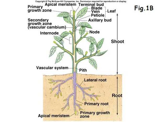 El sistema radicular es responsable de las hojas y el resto de la planta con las materias primas necesarias para el metabolismo y la fotosíntesis. De la figura 1B se dará cuenta de que el sistema radicular se ramifica ampliamente para permitir una máxima superficie para la absorción adecuada de agua y nutrientes del suelo. Todo lo que es absorbido por las raíces son transportados hasta las hojas a través del tallo de la planta. En cambio, el oxígeno y azúcares producidos por las hojas se transportan hasta las raíces por el tallo. Las raíces no estén expuestas a la luz solar y por lo tanto no pueden fabricar sus propios azúcares.