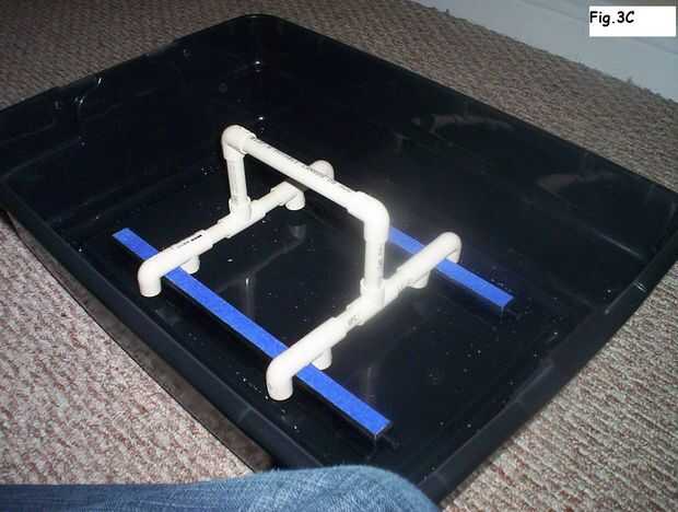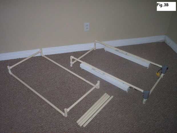 La parte superior y las porciones inferiores del marco son permanentemente montado con el cemento CPVC. Sin embargo, los perfiles verticales del marco no se pegan. Esto permite que el marco fácilmente ajustar en altura sumar o restar longitudes de tubería vertical mediante el uso de acoples de 3/4 de pulgada. El marco también puede ser easliy se derrumbó para almacenaje o transporte. (Figura 3B).