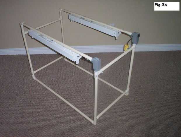 El marco está construido totalmente de conexiones y tubos CPVC de 3/4 de pulgada. También hay las cajas de conducto eléctrico de PVC de 1/2 pulgada que componen dos de las esquinas superiores. Estas cajas de la casa el interruptor para las luces y todas las conexiones eléctricas.