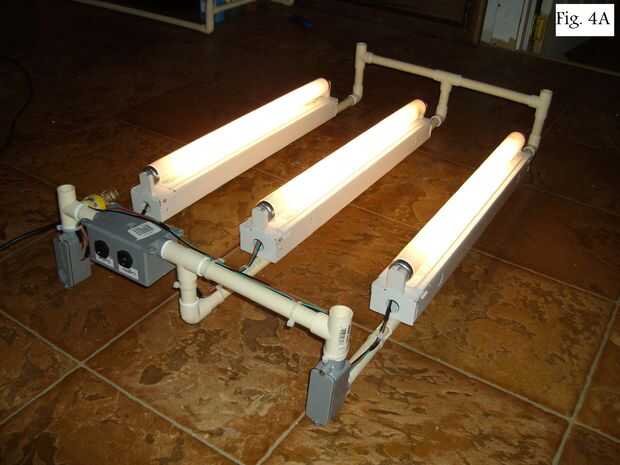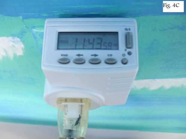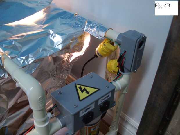 Aunque las lámparas son ment ser techo montado y con cable directamente a la red eléctrica de la casa, alambré les con el enchufe para que esta unidad podría ser fácilmente desconectada y transportada o almacenada. El uso de una corriente de energía también permite un temporizador programable estándar automáticamente controlar todo de la electrónica (Figura 4).