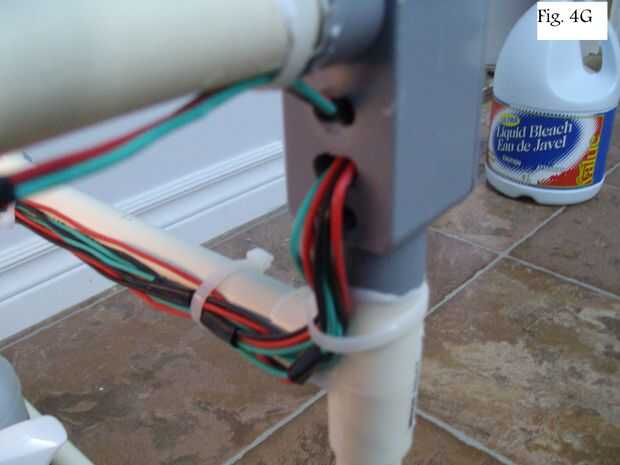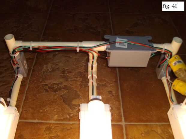 Para hacer todo agradable y limpia usé cinta aislante para cada conjunto de cables de las luces y el cable de alimentación. Usé los lazos zip para asegurar los paquetes a la estructura. También se utiliza un trozo de tubería para cubrir los cables de corriente del enchufe a la primera caja de conductos (figura 4I) del encogimiento.