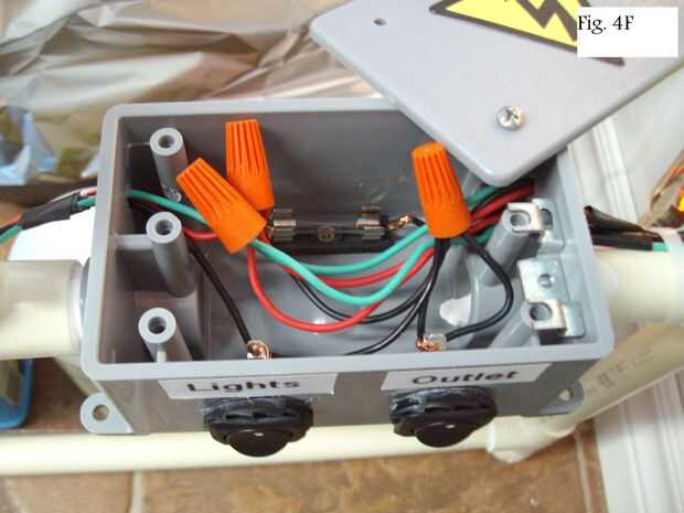 El cable de alimentación va desde el enchufe hasta la caja eléctrica principal. Este cuadro es el eje principal de distribución de energía para el sistema eléctrico. En el interior, como los alambres del cable de alimentación principal, el cable de luz y el cable de salida están conectadas en paralelo. El hilo para que el cable de alimentación principal es interrumpido por un fusible de 2 amperios antes de ser conectado a los cables. El tocar los cables para las luces y la salida son interrumpidos por un interruptor de palanca antes contuining a sus respectivas cargas (figura 4F).
