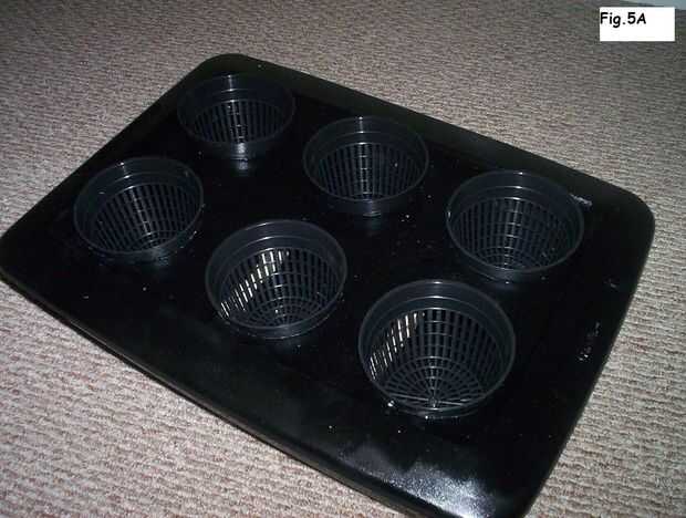 Las macetas no son perfectamente cilíndricos en forma. El radio de la parte superior es más grande que el radio de la parte inferior. He trazado las tapas de las ollas en la tapa de la bolsa y cortar los agujeros con un cuchillo. Los agujeros son suavemente más pequeño que los rastros para que el borde de la maceta las capturas en el borde del agujero y no cae en el depósito. El depósito debe ser lo suficientemente profundo para que haya un espacio entre la parte inferior de las macetas y la parte superior de las barras de aire.