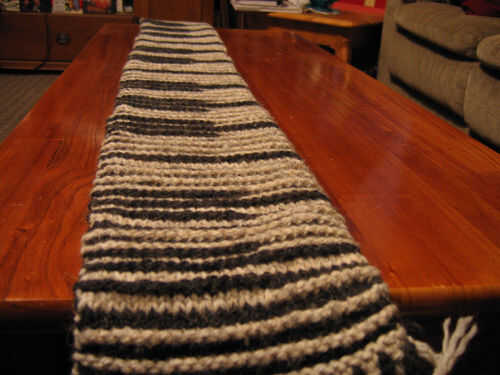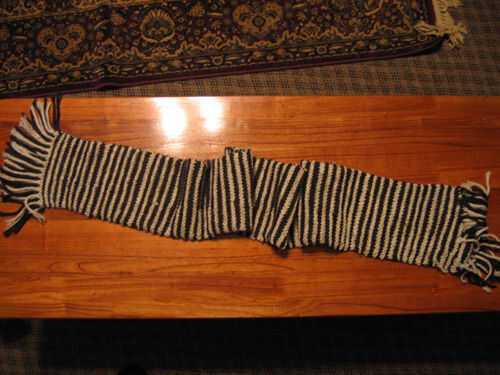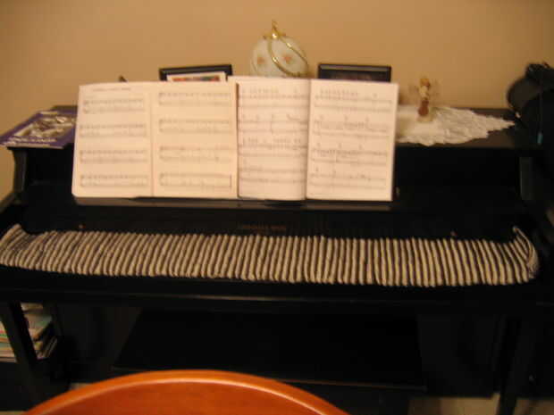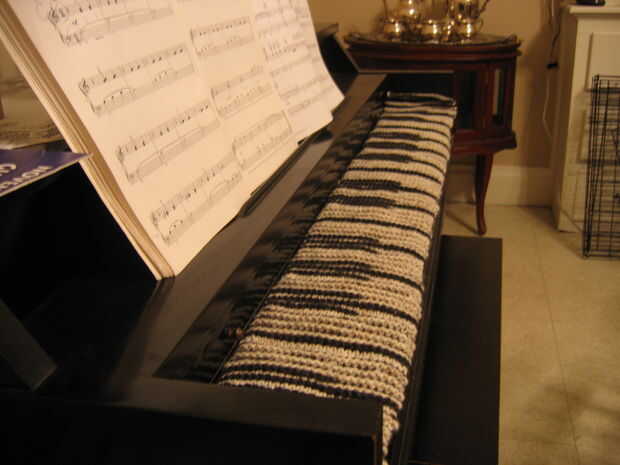 He utilizado hilo de León marca lana-facilidad peinada de peso. La bufanda entera es de aproximadamente 5 pies de largo y me tomó cerca de dos semanas de tardes a tejer. Mi esposa (profesora de música) vieron inicialmente y preguntó, "¿Qué es?" "Un piano", le respondí. Ella dijo lo que esperaba que ella diría... "No se ve como un piano para mí." Así lo sostuvo para arriba y dijo, "Eso es porque usted necesita mirar desde una perspectiva diferente". Ella pasó los siguientes cinco minutos, subir y bajar para ver el patrón entran y salen de foco.