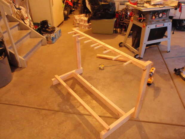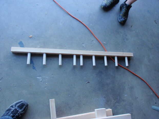 Tomar el trozo de 2 x 2 46 pulgadas y marque por consiguiente donde necesita los partidarios de cuello para ser. Esto depende en cuántas guitarras tienes y cuánto espacio que desee entre ellos. Llevó mi padre y yo para siempre hacerlo. Disculpen las molestias. Cuando termines, tornillo de 2 x 2 en las dos 2x3s de pie. Asegúrese de que las piezas de dowell cara hacia afuera.