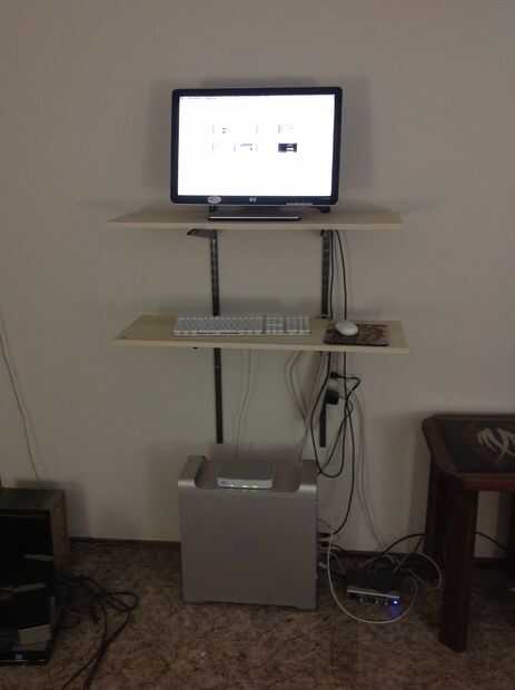 Puse los soportes del estante en los rieles, puso las tablas en los soportes y empezaron a poner mi sala de estar de nuevo juntos. I eventualmente planea fijar los estantes en su lugar con tornillos y posiblemente de la arena y les mancha. Por el momento aunque estoy contento con él.