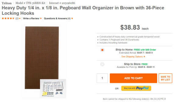 Venden una hoja de 24 "X 48" del material que también se incluye 36 DuraHooks por $39 en Home Depot. Debe ser ordenado en línea y envía a la tienda. Cuando usted recoger en la tienda, se cortaron lo tamaño para usted sin costo alguno.
