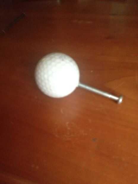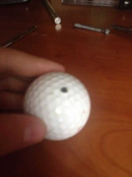 Taladrar un agujero en la pelota de golf un poco más pequeño que el tornillo, entonces uno de los pernos de tornillo. Use pegamento para fijar la manija del perno con un poco de sala antes de que toque la bola.